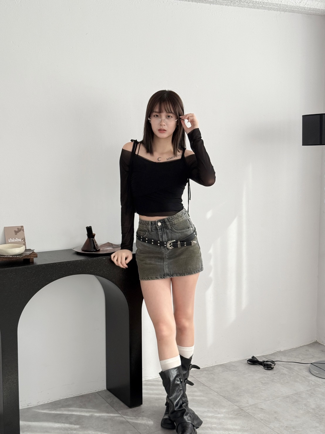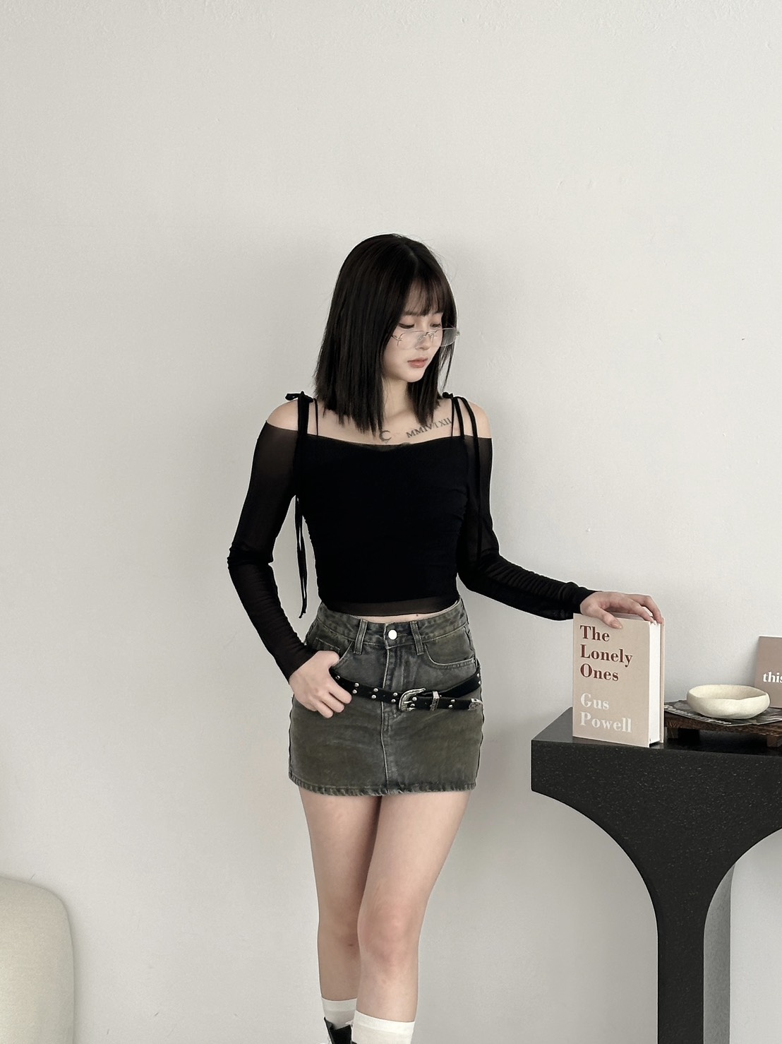 # 霧灰綁帶一字領透膚上衣