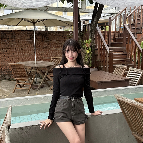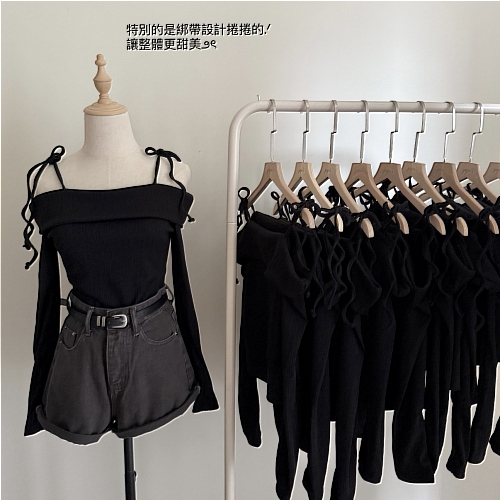 # 螺紋綁帶一字領修身長袖