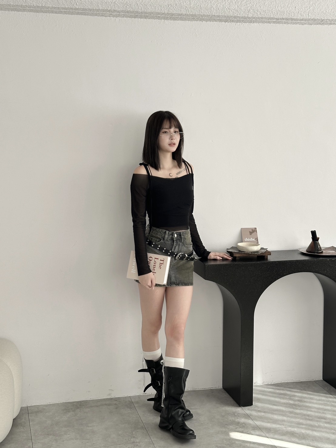 # 霧灰綁帶一字領透膚上衣