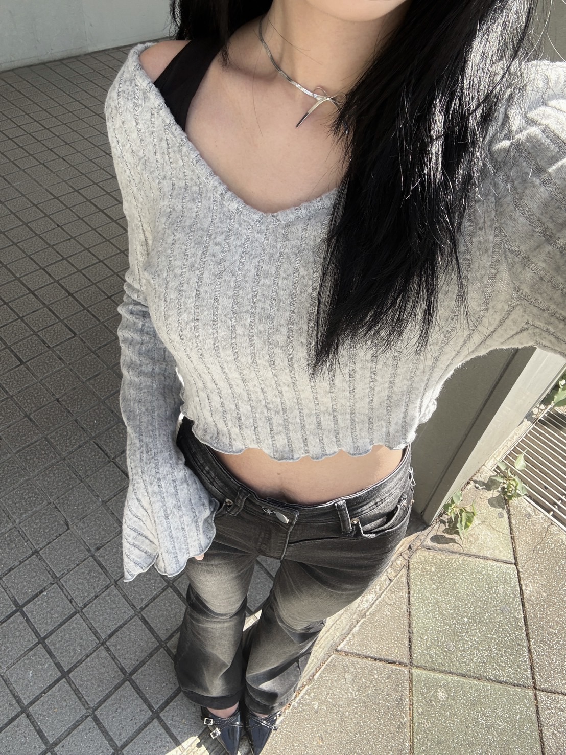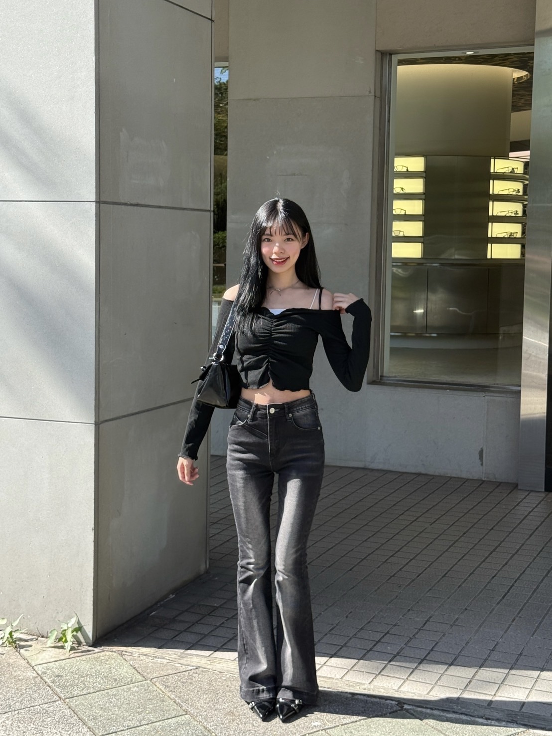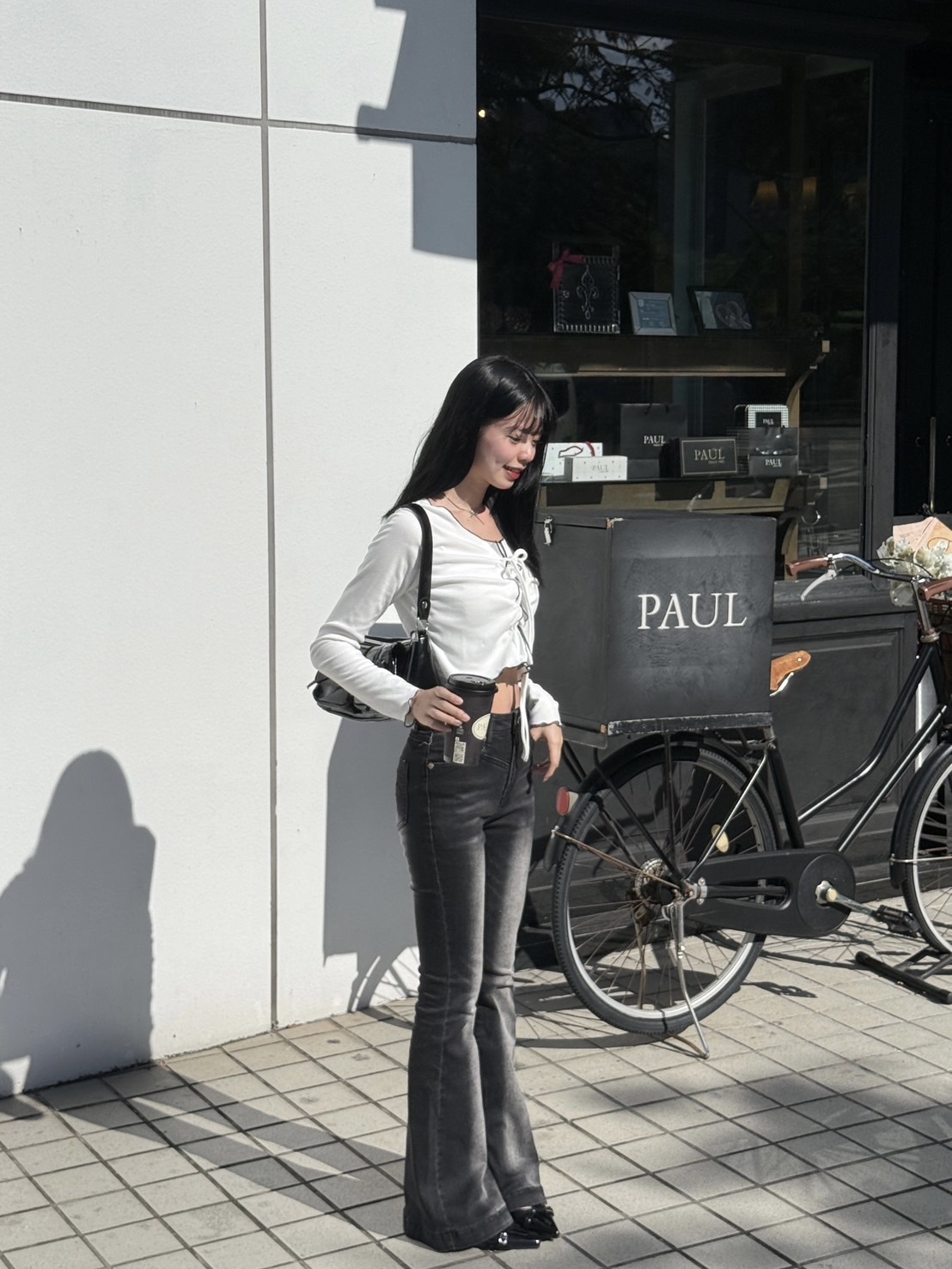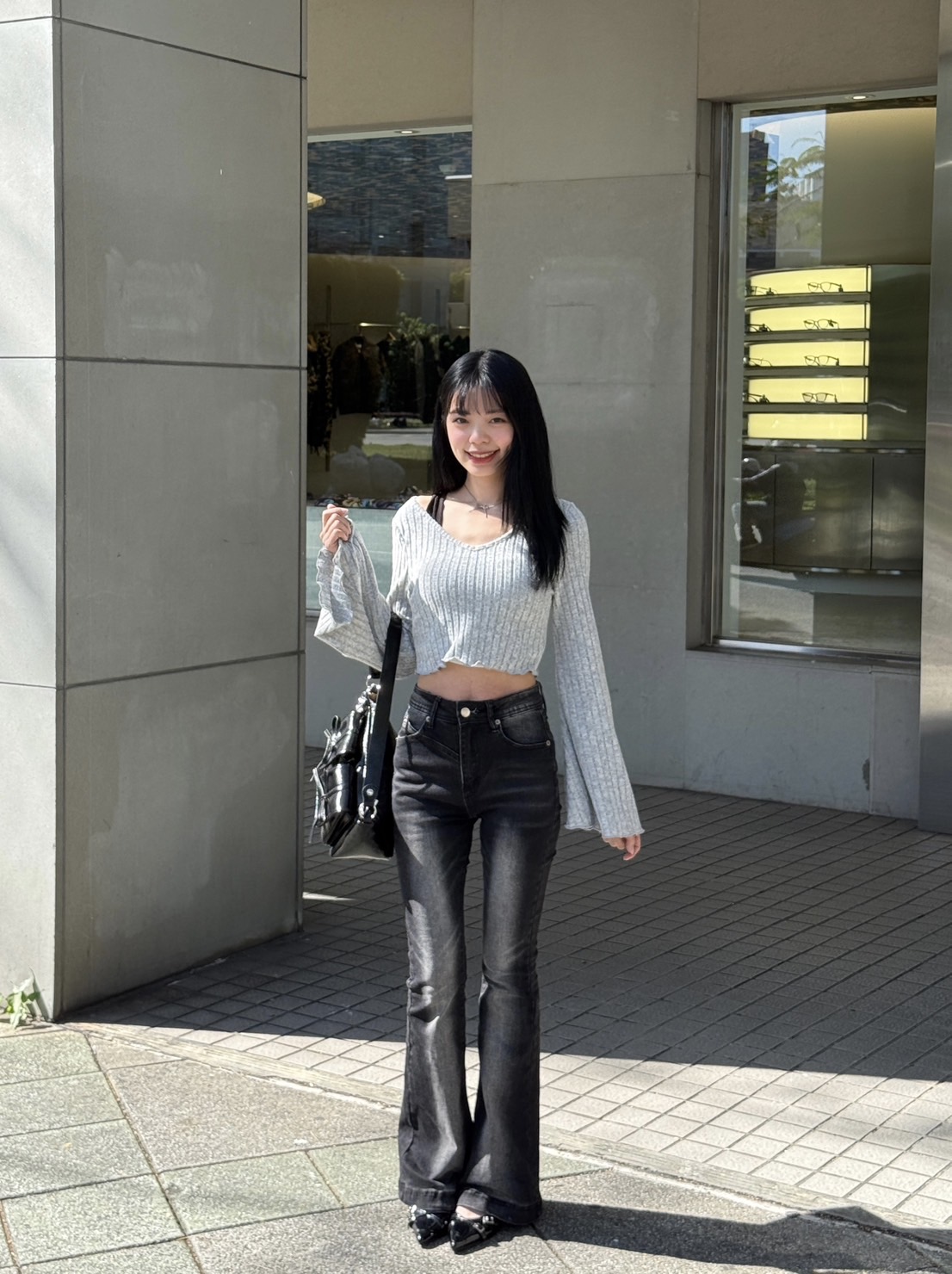 # 酷酷黑灰刷白微喇叭牛仔長褲