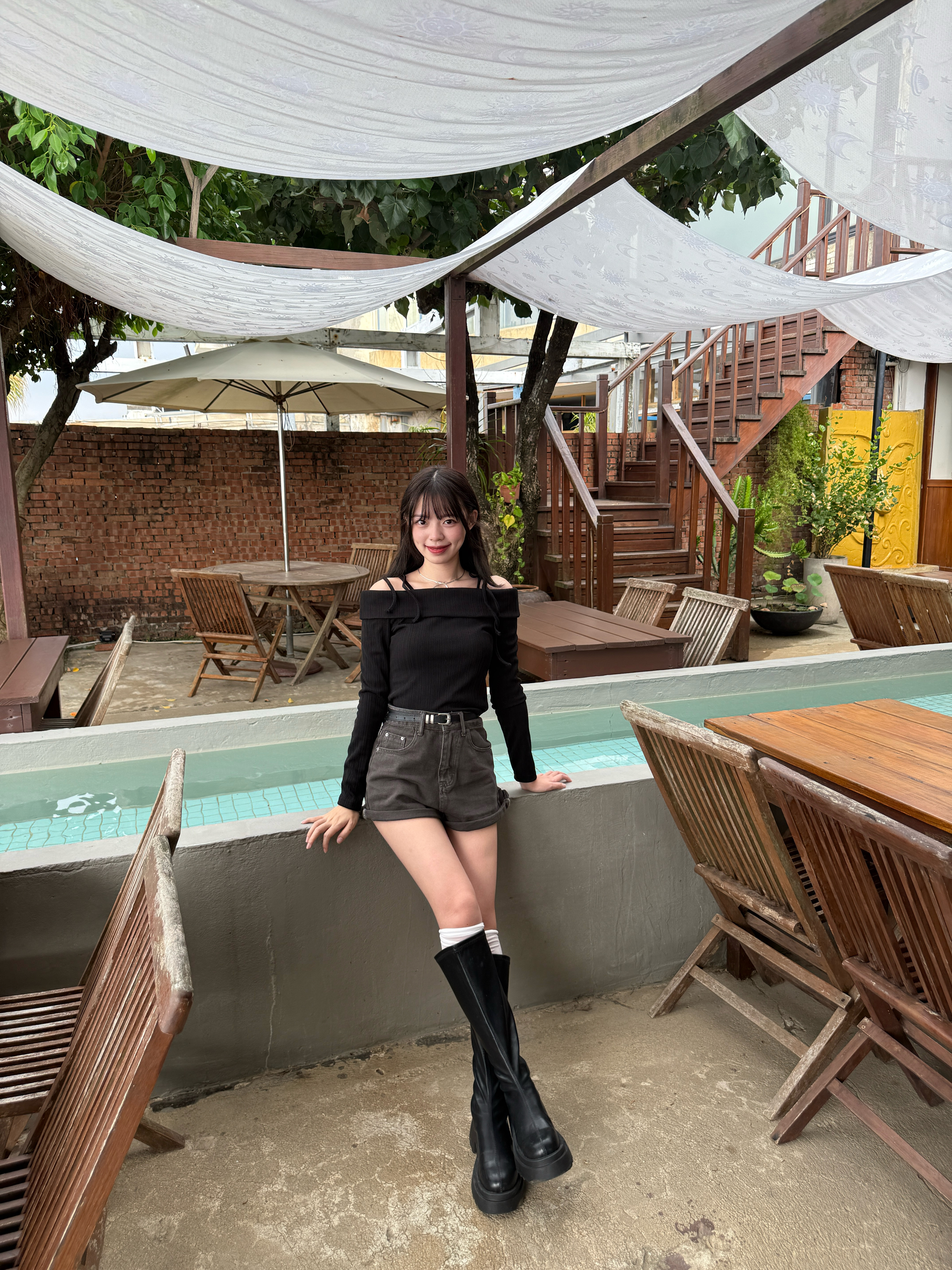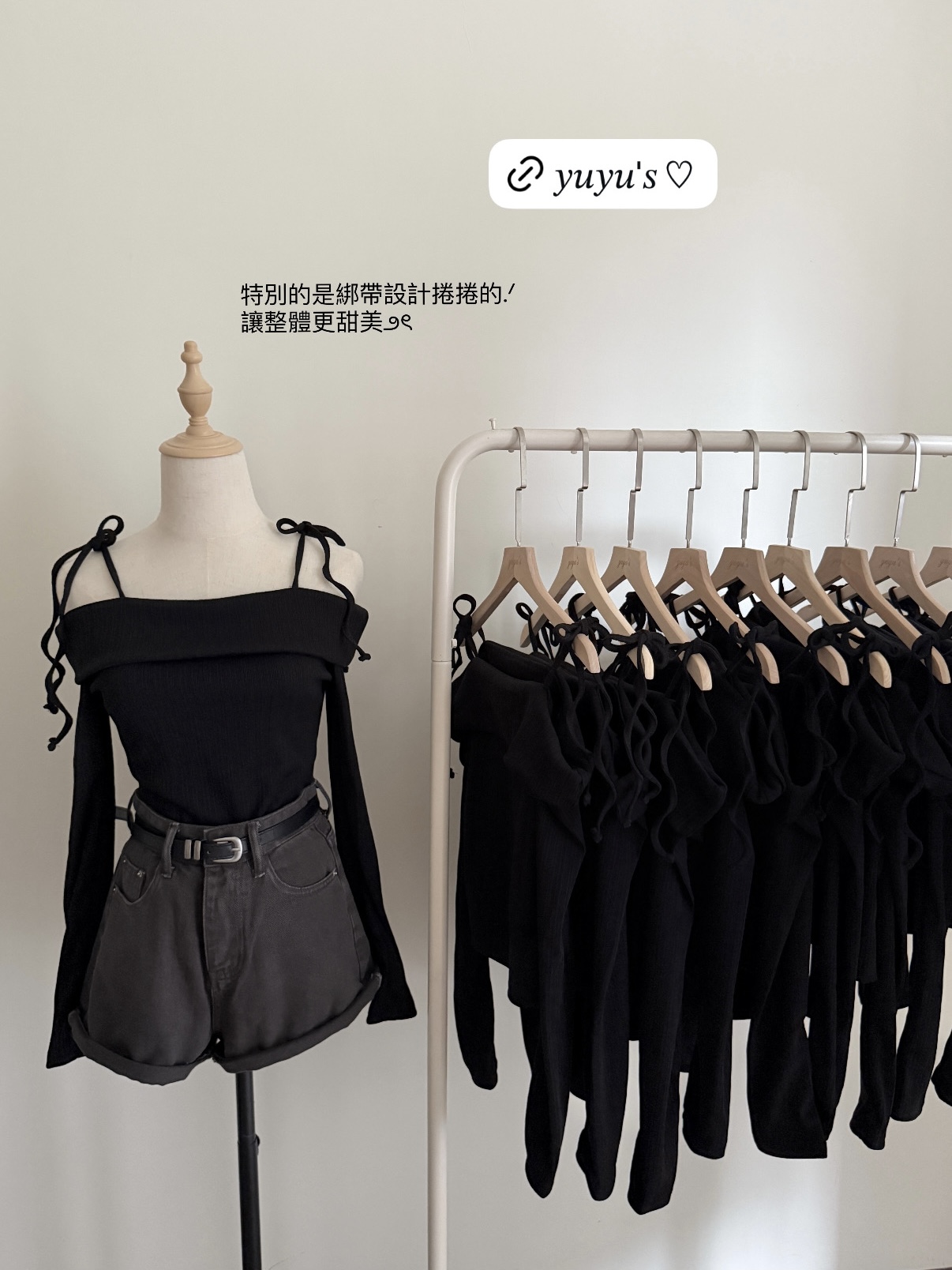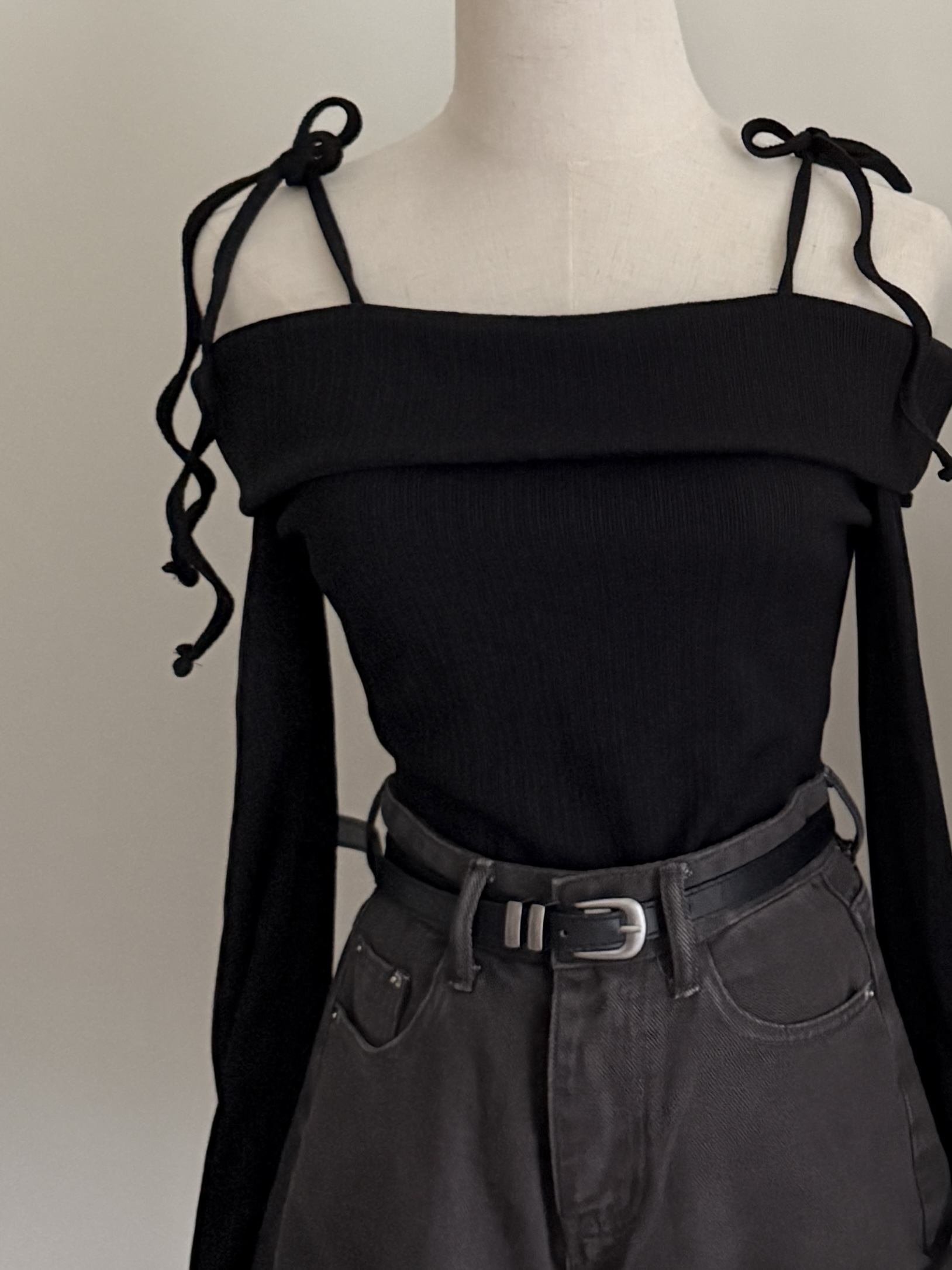 # 螺紋綁帶一字領修身長袖