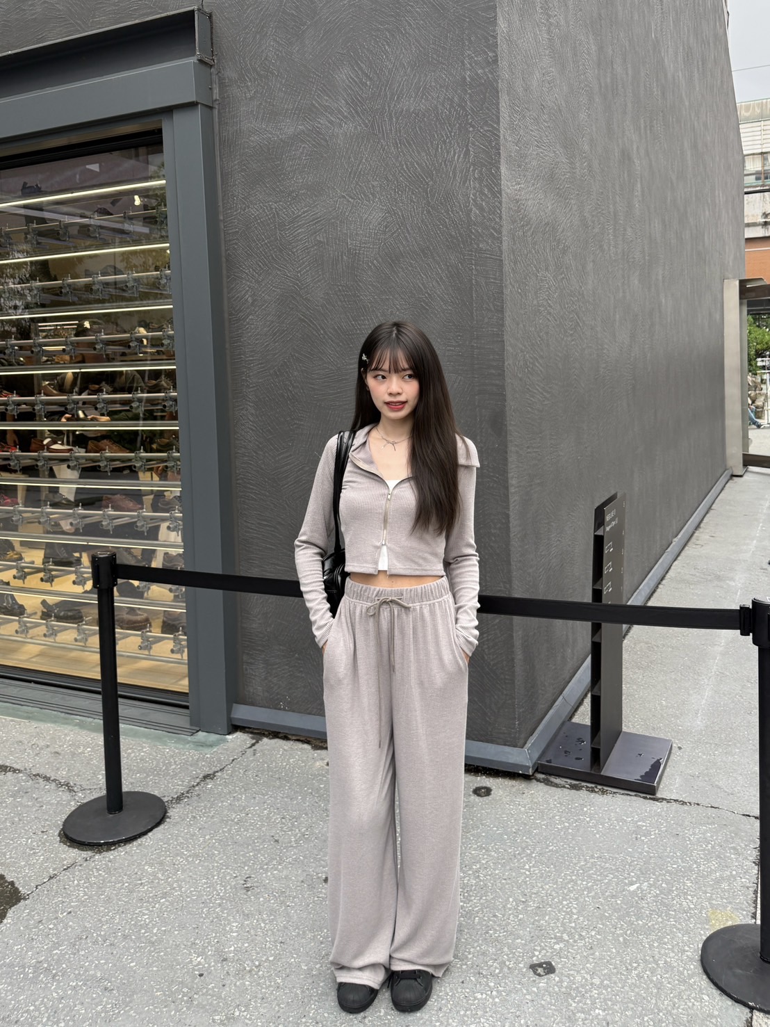 # 韓製柔軟螺紋翻領拉鍊兩件套