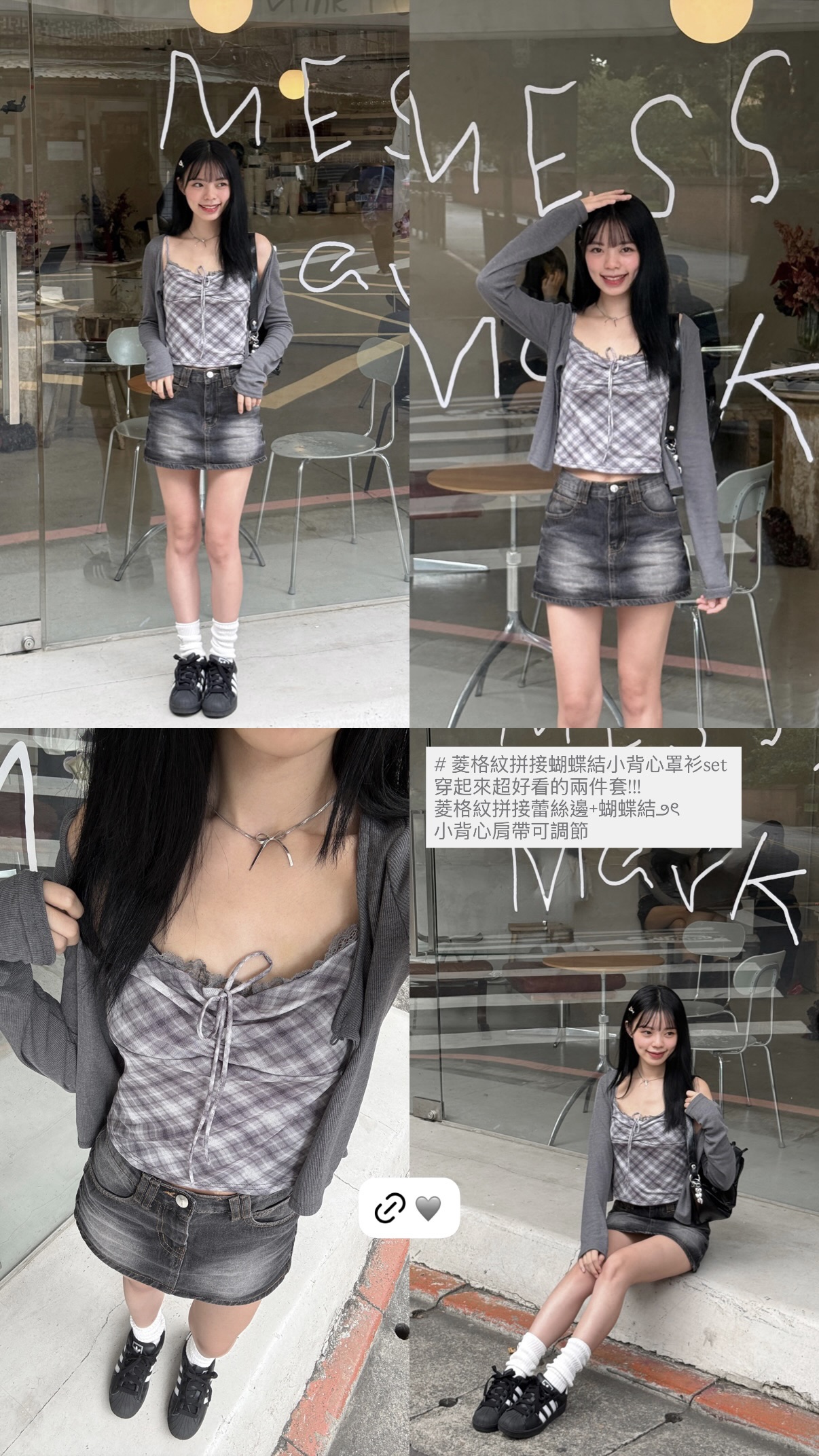 # 菱格紋拼接蝴蝶結小背心罩衫set