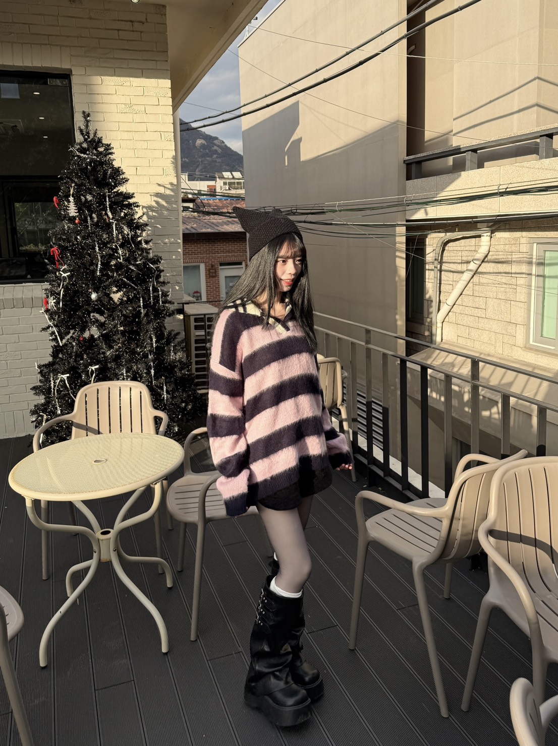 韓製 | 翻領縮腰綁帶條紋毛衣