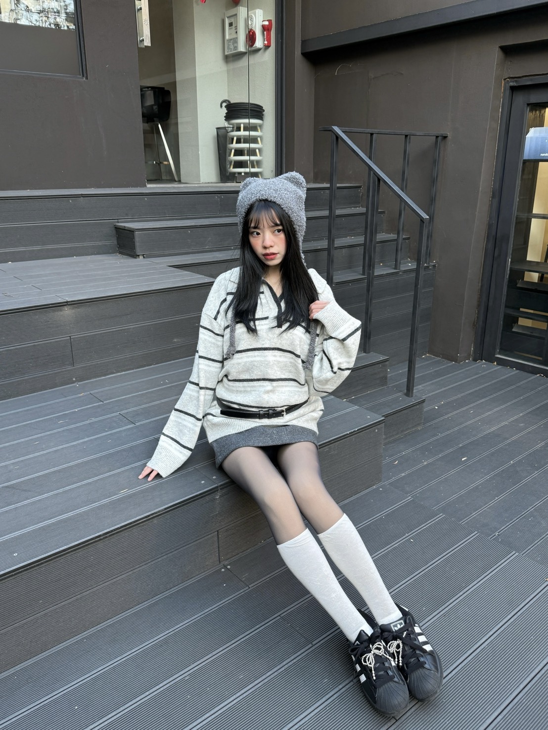 韓製 | 翻領條紋拼接長版毛衣