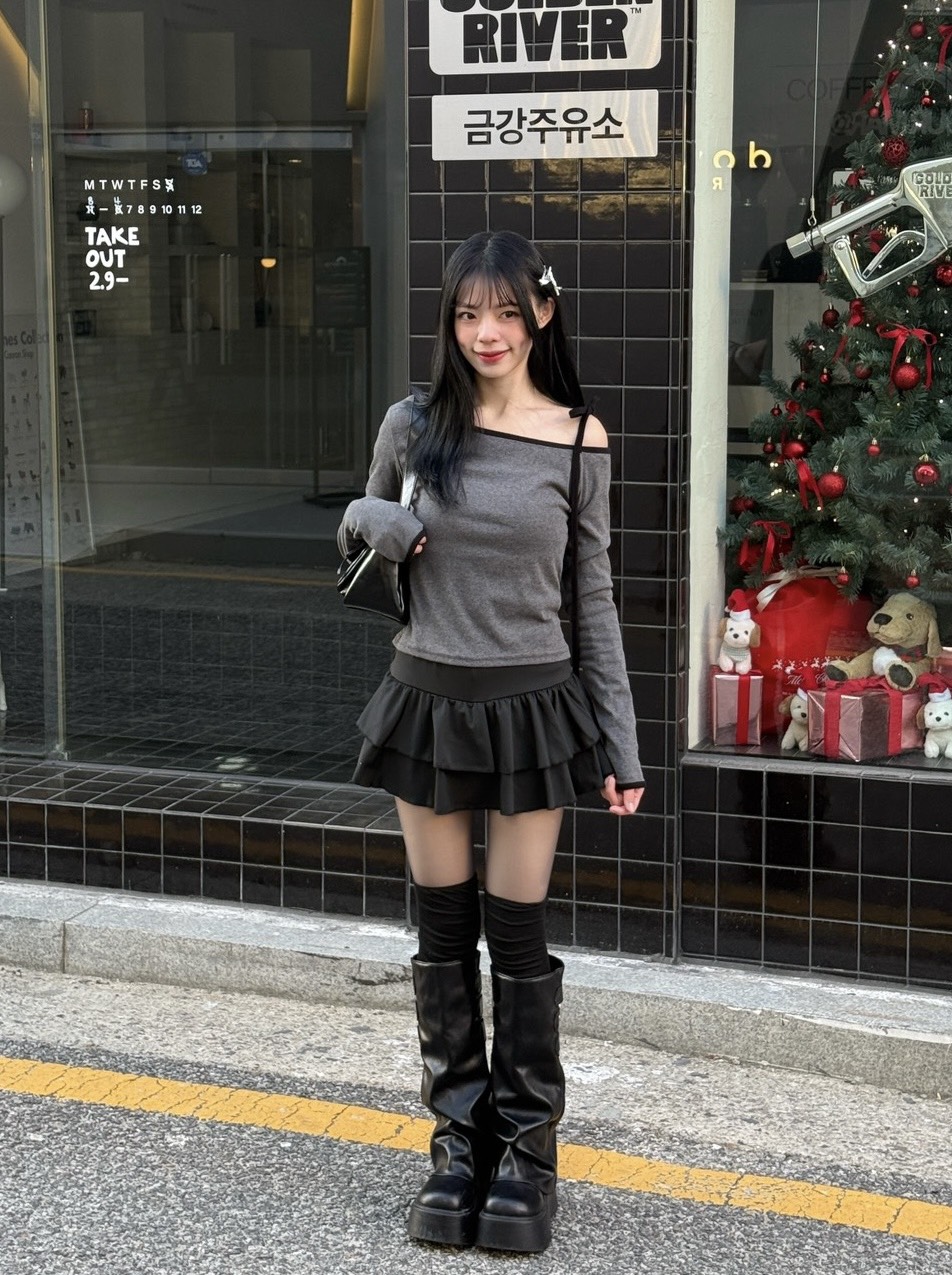 韓製 | 斜肩綁帶拼接長袖
