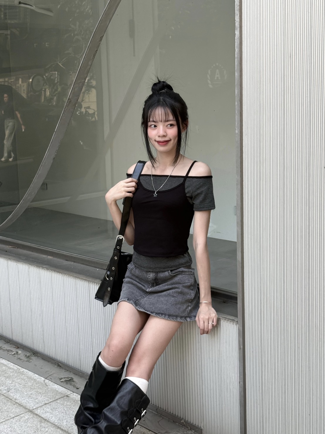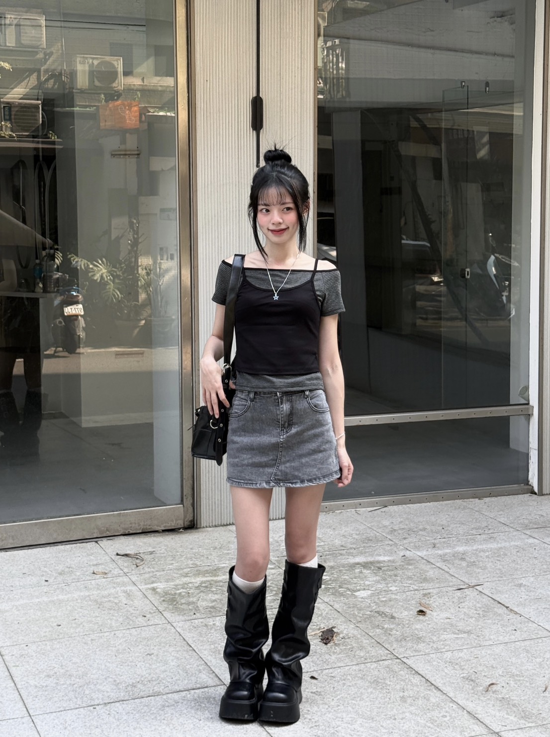 條紋一字領+小背心 假兩件設計